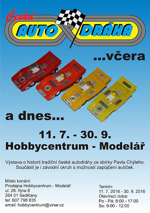 Od 11. 7. do 30. 9. 2016 je pro Vás všechny připravena výstava o historii tradiční české autodráhy ze sbírky Pavla Chýleho ml. Na výstavě je možné si prohlédnout téměř 70 autíček, déle ovladače, panely a další doplňky české autodráhy Ites, Gama, Gonio a Faro. Expozici ještě doplňují dobové papírové vystřihovánky Luboše Vinaře, které v sedmdesátých letech vydal časopis ABC jako doplněk k české autodráze.